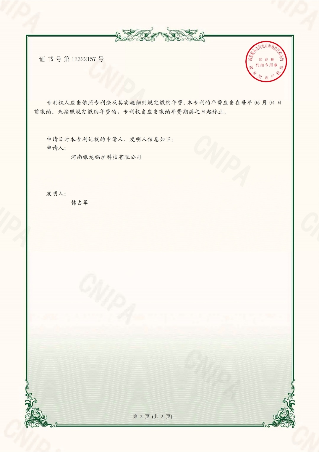 分艙式電開(kāi)水鍋爐使用新型專利證書
